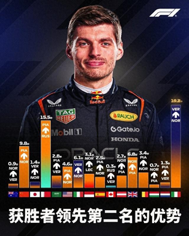 F1意大利大奖赛,红牛车手维斯塔潘以1小时13分24秒325的完赛时间夺得冠军,领先第二名迈凯轮车手诺里斯19.2秒,创造了2025赛季迄今为止的最大获胜领先优势。